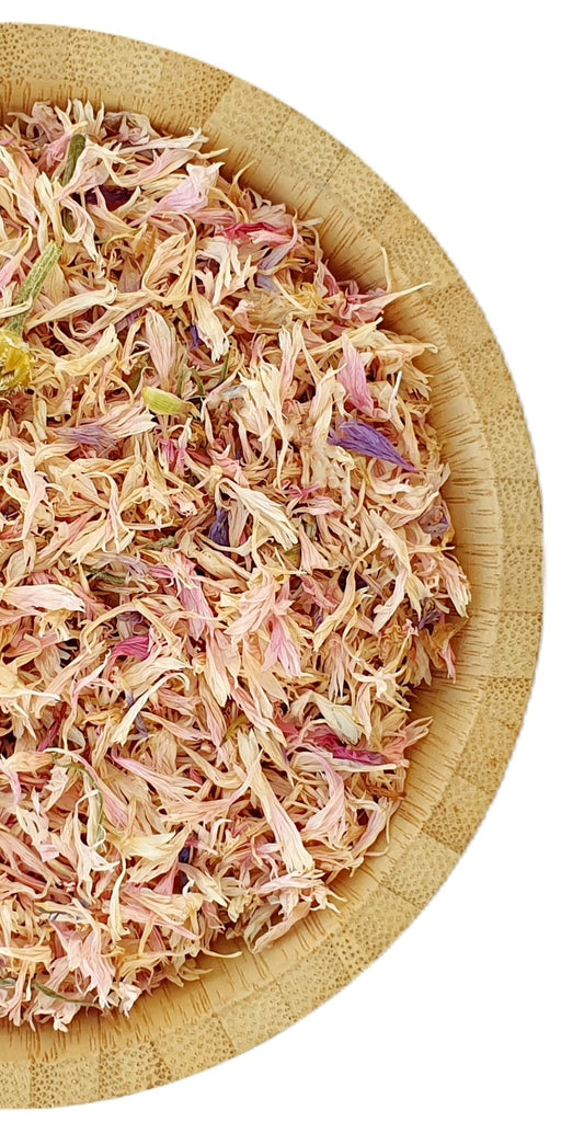 Light Pink cornflower petals (Centaurea cyanus) prepared as a food-grade edible flower. These dried petals are suitable for herbal tea infusions, cake decoration, cocktail garnish and colourful floral blends.